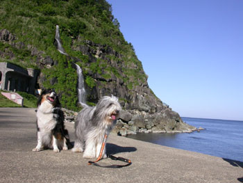 後ろに見えるのは、海に落ちる滝です