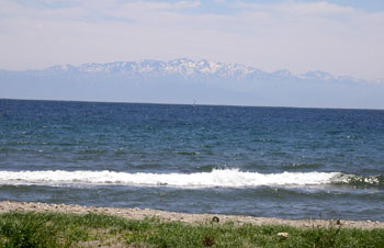 途中、青い海の向こうに、幻のように雪山が・・・!